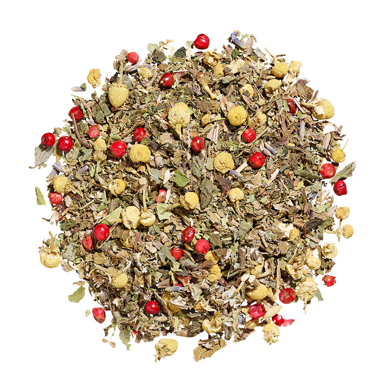 Zutaten: Brennnesselblätter, Spitzwegerich, Zitronenverbene (14 %), Kamillenblüten (13 %), rosa Pfeffer, Himbeerblätter, Apfelminze, Lavendelblüten (6 %) Inhalt: 100 g