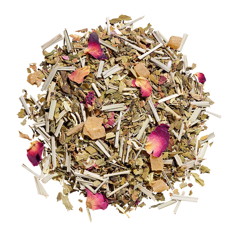 Zutaten: Mate grün (22 %), Pfefferminzblätter (22 %), Zitronengras, Brennnesselblätter, Grüner Tee (8 %), Ananasstückchen (Ananas, Zucker) (4 %), Löwenzahnblätter, Aroma, Rosenblüten, Ringelblumenblüten, blaue Malvenblüten Inhalt: 100 g