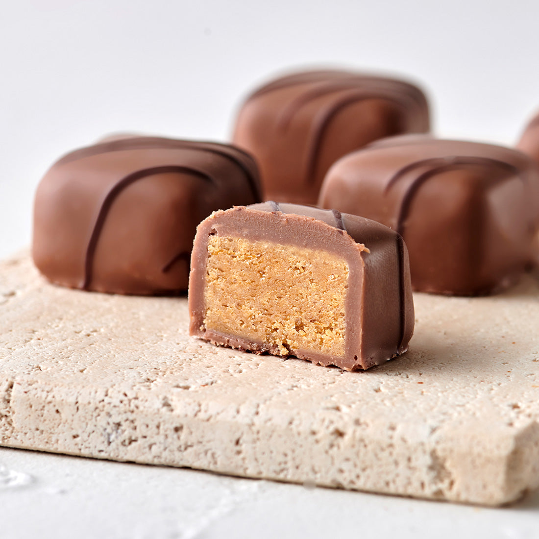 Our Premium Selection Assorted Chocolates include two of each of our five most popular pralines and truffles. We use only the finest ingredients and all-natural raw materials. We consistently avoid adding preservatives and never use palm oil. Our chocolates get their delicate flavor solely from the natural intensity of their ingredients. The ten chocolates are packaged in a clear box to keep them fresh for longer.