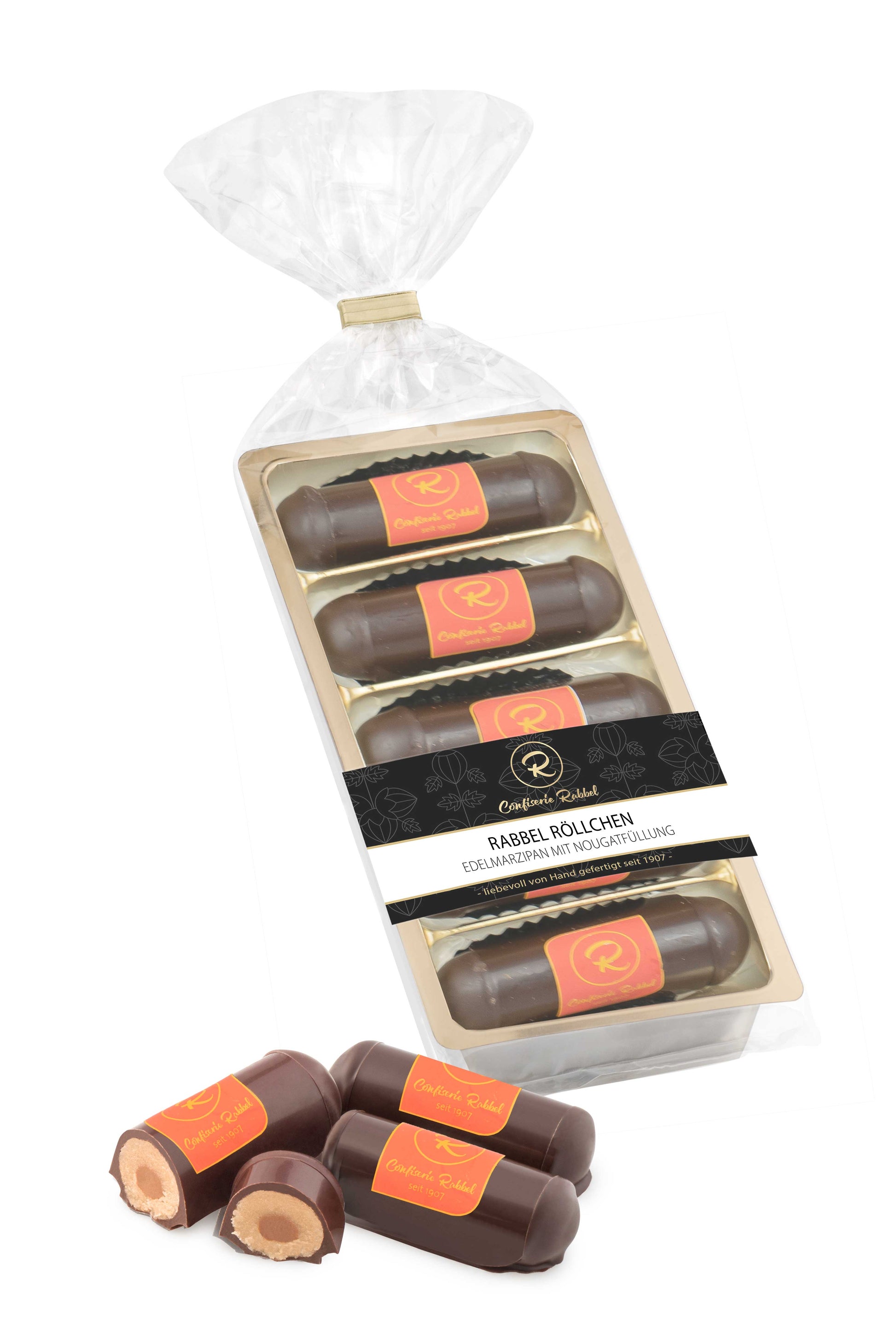 Ein Highlight sind die Rabbel-Röllchen, die mit feinem Nougat und Edel-Marzipan gefüllt sind. Diese kleinen Leckerbissen werden mit einer zartschmelzenden Zartbitterschokolade umhüllt, die dem Ganzen eine angenehme Bitternote verleiht.