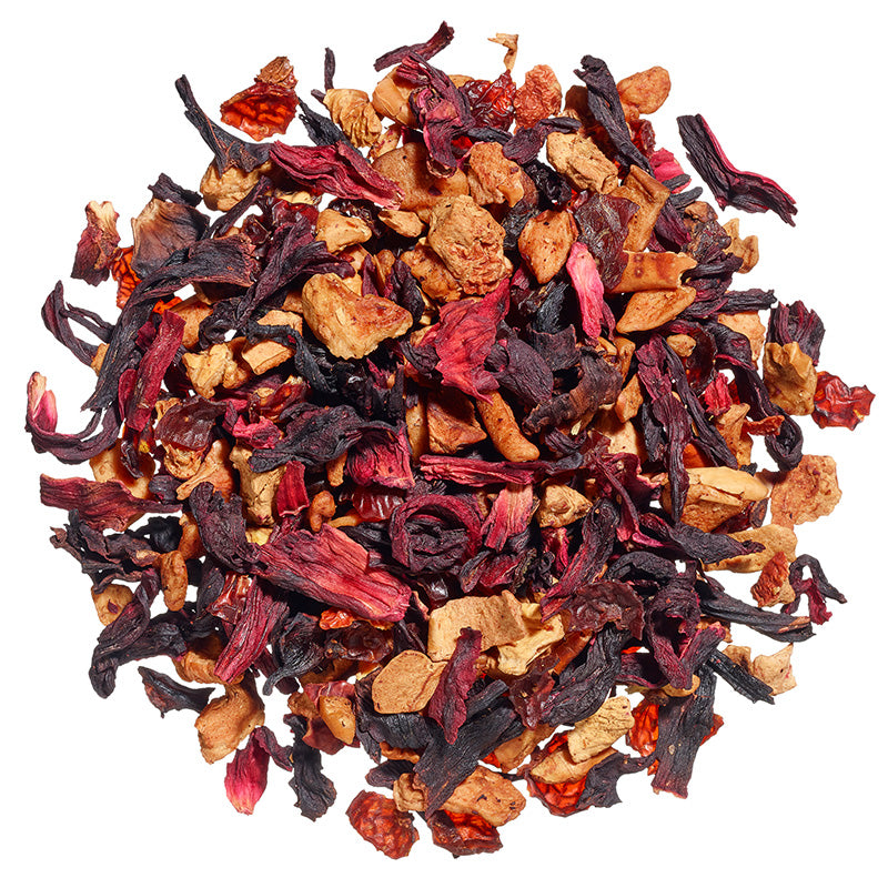 Zutaten: Apfelstückchen, Hibiskus, Hagebuttenschale, Sultaninen, Aroma