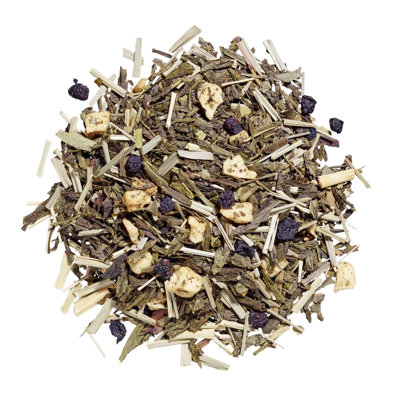 Herkunft: China, Erntezeit: Sommer: Zutaten Grüner Tee (63 %), Zitronengras (12 %), Apfelstückchen, Heidelbeeren (6 %), Aromen, Zitronenmyrte