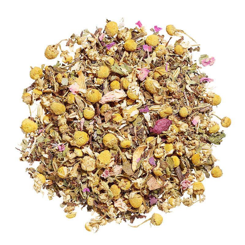 Zutaten: Kamillenblüten**, Pfefferminz-**, Melissen-**, Erdbeerblätter**, Fenchel**, Orangenblüten**,Lavendel-**, Rosenblüten** Inhalt: 100 g