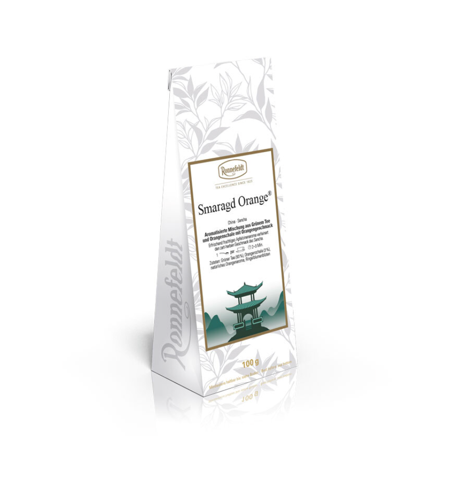 Herkunft: China, Erntezeit: Sommer, Zutaten: Grüner Tee (93 %), Orangenschalen (3 %), natürliches Orangenaroma, Ringelblumenblüten